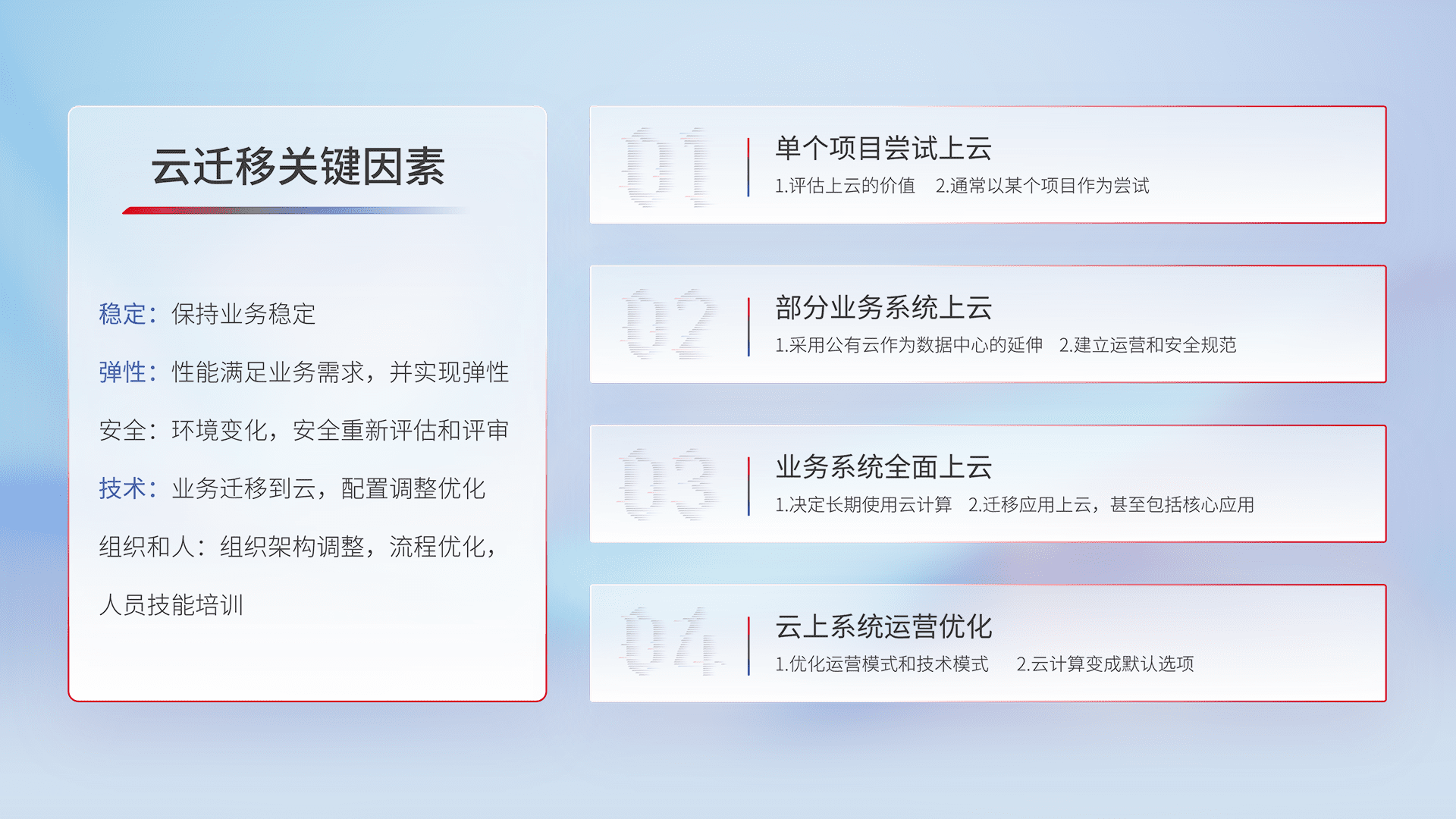 结合实际业务,,,从规划设计、、、云平台选型、、云原生改造、、数据迁移、、集成交付,,,迁移全过程为客户识别最佳上云路径,,做好风险识别管理,,,,设计网络架构、、、身份权限、、、安全审计合规、、操作审计、、日志审计、、监控告警策略、、多站点容灾设计等,,对云上基础设施进行整体规划,,提升IT治理水平,,,,以满足弹性、、高可用、、高性能的需求。。