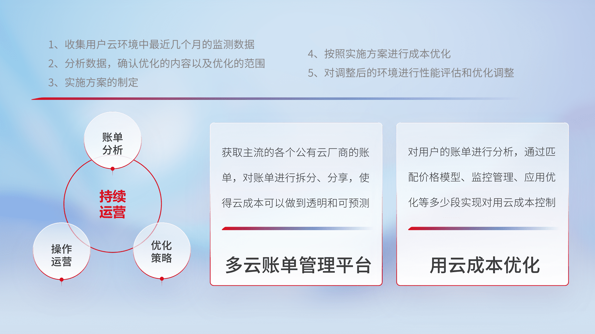 通过多云纳管,,,以统一的资源数据模型把客户的云资源进行抽象和封装,,,进而实现对多云资源的统一操作,,,保障云资源管理的可靠性、、稳定性与可用性。。。。量身定制化运维内容,,,,配置、、开发运维、、、补丁管理、、备份、、、监控、、、认证和访问管理、、、审计和日常巡检等,,保障在用云过程中的可靠度,,,稳定度以及高可用率。。。